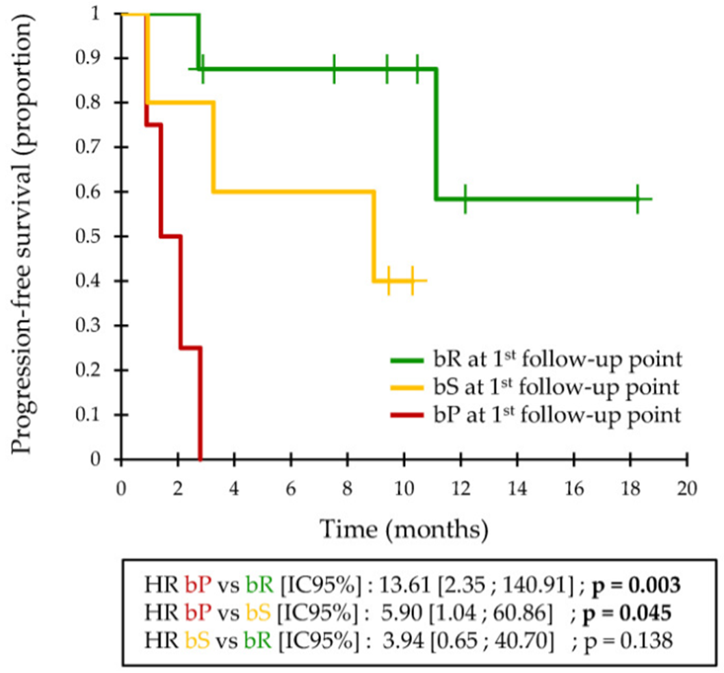 圖1.基于首次隨訪時(shí)ctDNA濃度變化的無(wú)進(jìn)展生存期率(bP,ctDNA濃度上升;bR,ctDNA濃度下降;bS,ctDNA濃度變化平穩(wěn))