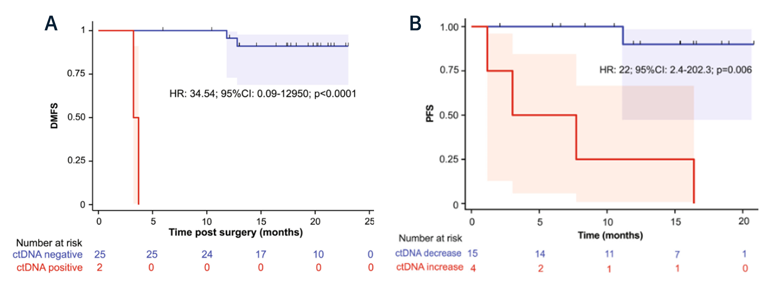 · 術(shù)后隨訪中,6 例患者的 ctDNA 再次 “出現(xiàn)”,而這 6 例患者全部發(fā)生了臨床復(fù)發(fā),且 ctDNA 陽(yáng)性比影像或癥狀提示復(fù)發(fā)平均提前了 280 天!